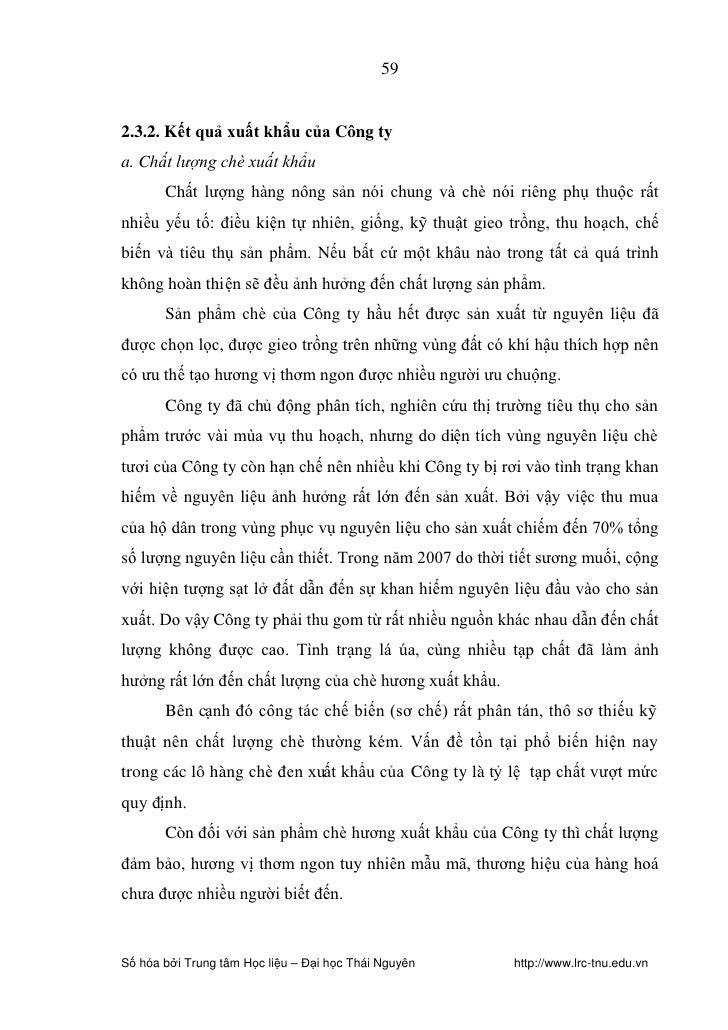 Khâu chế biến có tác động trực tiếp đến chất lượng sản p hẩm xuấtkhẩu. Chất lượng là yếu tố then chốt quyết định kết quả xuất khẩu Trà Tân Cương Thái Nguyên của tất cảcác mặt hàng. Với mặt hàng chè thì chất lượng lại càng có ý nghĩa hơn vì chèlà một trong những đồ uống cao cấp rất được ưu dùng trên thế giới.